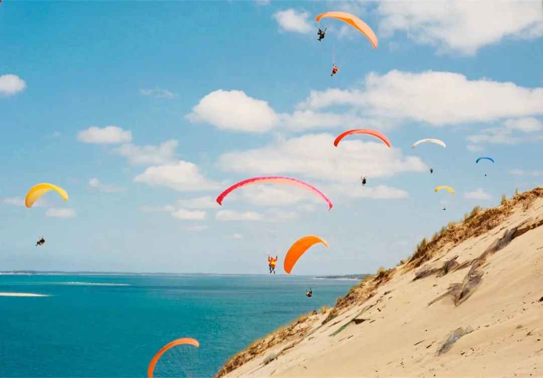 Conquering the Dune du Pilat on foot is no easy feat. With a slope of 70 degrees and soft, shifting sand, many visitors find themselves struggling halfway up. However, for those who persevere and climb the dune using the provided steps, a world of wonders awaits. Colorful paragliders and kites dot the sky, while the beach below is filled with people enjoying the sun, sea, and sand. Whether you're seeking adventure or simply looking to relax, the Dune du Pilat offers something for everyone.