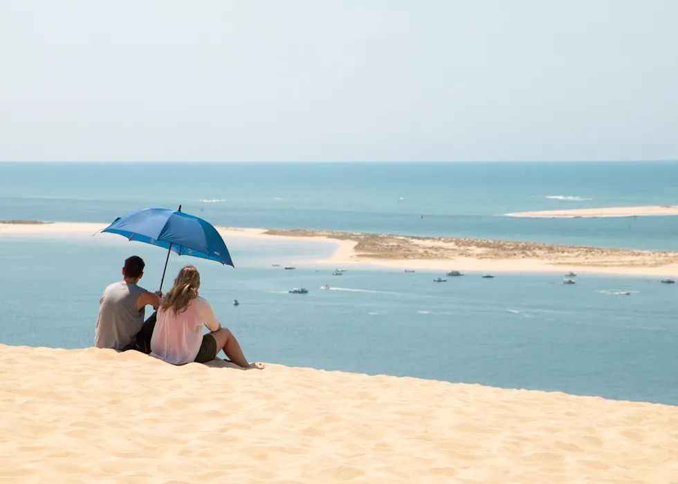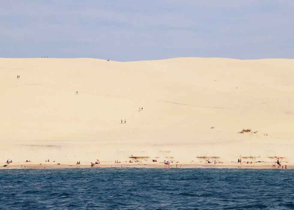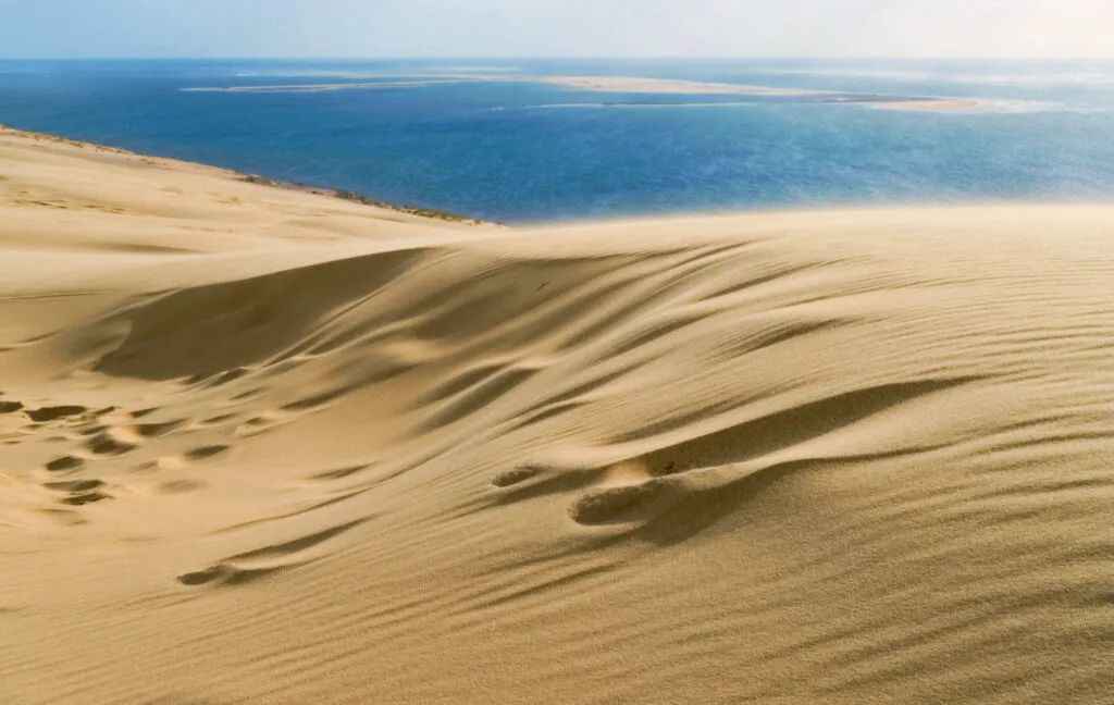 The Arcachon Bay, filled with the waters of the Atlantic, is a veritable inland sea, more precisely, a vast triangular lagoon. Sheltered from the fierce waves of the Atlantic by the surrounding land, the bay enjoys a mild climate, reminiscent of spring all year round, with ample sunlight and a pleasant atmosphere. While the crystal-clear blue waters and the miles of white sandy beaches are already impressive, what truly sets Arcachon apart is the breathtaking sight of the desert and the sea coexisting side by side.